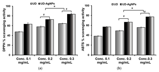 The antioxidant activity of AgNPs produced from U. dioica extract was measured and compared to the DPPH (a) and ABTS (b) assays. At various concentrations, the antioxidant capacity was measured (0.1, 0.2, and 0.3 mg/mL). The radical scavenging abilities of DPPH and ABTS were dose dependent, implying that as the concentration of AgNPs increased; similarly, the scavenging activities increased against both radicals (the antioxidant potential for DPPH and ABTS was 63.3–83.5% and 56.7–77.1%, respectively). The data are shown as the mean ± SD (n = 3). Statistical significance was ascribed as * p < 0.05 (intergroup) and # p < 0.05 (intragroup) compared with and 0.1 mg/mL of the respective groups.