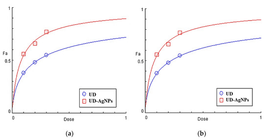 Dose–response profiles of the calculated EC50 (mg/mL) of Urtica dioica (UD) and biosynthesized nanoparticles of UD (UD-AgNPs) in the DPPH (a) and ABTS (b)-free radical scavenging tests.