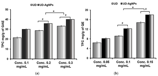 Total phenolic (a) and flavonoid (b) contents of Urtica dioica (UD) and biosynthesized silver nanoparticles of UD (UD-AgNPs). The data are shown as the mean ± SD (n = 3). Statistical significance was ascribed as * p < 0.05 (intergroup) and # p < 0.05 (intragroup) compared with and 0.1 mg/mL of the respective groups.