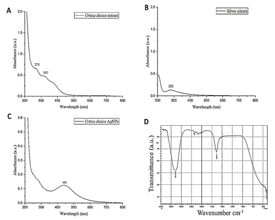 UV–visible spectra of Urtica dioica extract (A), silver nitrate (B), and biosynthesized nanoparticles of UD (C) in the absorption spectrum of 200–800 nm. The functional groups of Urtica dioica leaf extract responsible for the formation and stability of silver nanoparticles (UD-AgNPs) were investigated using FTIR (D) with a scan range of 400–4000 cm−1.