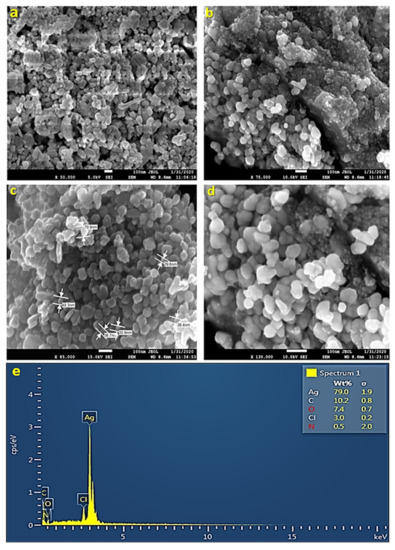 Scanning electron microscopy helps in the quantitative and qualitative analysis of nanomaterials. It determines the shape and size of AgNPs. SEM works on the principle of scanning the nanoparticle sample under an electron beam of high energy. The sample is placed under vacuum conditions. SEM provides images with high resolution, which makes it a useful and widely employed instrument in determining the size and shape of NPs. The SEM images revealed that the shape of some of the AgNPs obtained was spherical; some were oval, while others were irregular in shape. Figure 5a,b shows the size of AgNPs, which varies from 29 to 70 nm. The irregular shape of AgNPs could have been because of the temperature, pH, and concentration of AgNO3 (Figure 5a–d).