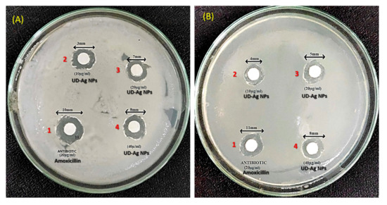The silver nanoparticles (AgNPs) were tested against E. coli and P. putida at different concentrations via the disc diffusion method by determining the zone of inhibition (Figure 6A,B). From Table 4 shown below, it can be observed that the diameter for the zone of inhibition is increased by increasing the concentration of the AgNPs. The control that was taken is amoxicillin, which is an antibiotic that possesses the maximum diameter in the table. Hence, the AgNPs extracted from nettle leaves possess antimicrobial or bactericidal properties as they were tested against an antibiotic. In all the above mentioned tabular cases, zones of inhibition are observed.