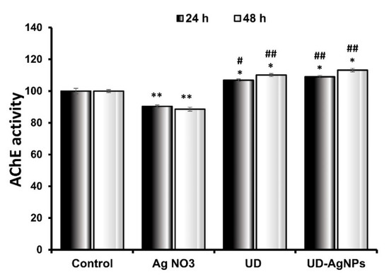 Acetylcholinesterase activity in Drosophila third instar larvae exposed to AgNO3, UD, and UD-AgNPs for 24 h and 48 h. The data are shown as the mean ± SD (n = 3). Significance is indicated as * p < 0.05 and ** p < 0.01 vs. control. # is ascribed as significance at p < 0.05 and ## p < 0.01 compared with AgNO3. AgNO3 = silver nitrate, UD = Urtica dioica, and UD-AgNPs = biosynthesized silver nanoparticles of Urtica dioica.