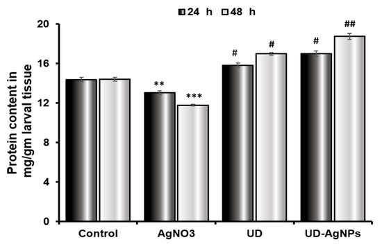 The protein concentration in third-instar Drosophila melanogaster (Oregon R+) larvae treated with AgNO3, UD, and UD-AgNPs for 24 h and 48 h. The results are the mean ± SD of three replicates of the same experiments. Significance is ascribed as ** p < 0.01, and *** p < 0.001 vs. control. # = significance at p < 0.05, and ## p < 0.01 compared with AgNO3. AgNO3 = silver nitrate, UD = Urtica dioica, and UD-AgNPs = biosynthesized silver nanoparticles of Urtica dioica.