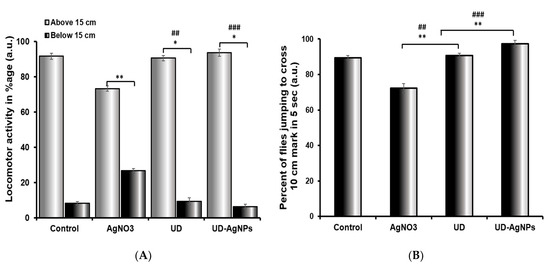 Climbing (A) and jumping (B) activity of Drosophila melanogaster (Oregon R+) flies exposed to AgNO3, UD, and UD-AgNPs for 120 h. The data are shown as the mean ± SD (n = 3). Significance is ascribed as * p < 0.05 and ** p < 0.01 vs. control. ## ascribed as significance at p < 0.01 and ### p < 0.0001 compared with AgNO3. AgNO3 = silver nitrate, UD = Urtica dioica, and UD-AgNPs = biosynthesized silver nanoparticles of Urtica dioica.