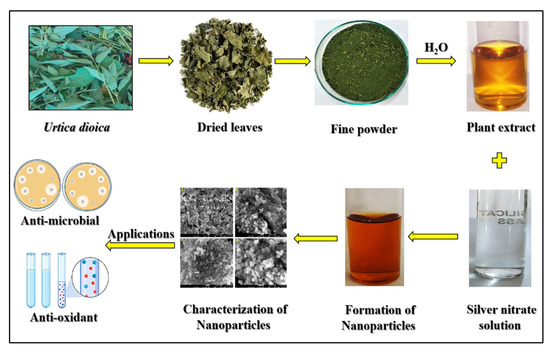 - Jyoti, K.; Baunthiyal, M.; Singh, A. Characterization of silver nanoparticles synthesized using Urtica dioica Linn. leaves and their synergistic effects with antibiotics. J. Radiat. Res. Appl. Sci. 2016, 9, 217–227. [Google Scholar] [CrossRef]