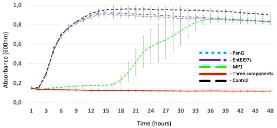 Growth-curve analysis demonstrated that MP1 at 0.2 ug/mL was able to delay the lag phase of LMGT 4219 growth during 15–16 h of incubation, while neither PenG at 5 ug/mL nor EntEJ97s at 1.0 ug/mL individually could inhibit bacterial growth (Figure 1). On the other hand, the mixture of the three components at their respective concentrations was effective against the pathogen and did not lose its antimicrobial activity even after 48 h incubation at 37 °C (Figure 1).