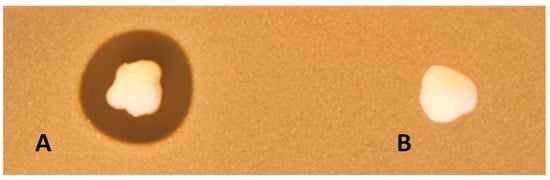 Assessment of antimicrobial activity of formulation containing MP1 (0.2 mg/mL), PenG (5 mg/mL) and EntEJs (1 mg/mL) dissolved in APO base cream (30% fat) (A). The APO base cream alone was used as a negative control (B). The activity was tested with a soft agar overlay assay using MRSP LMGT 4219 as an indicator strain.