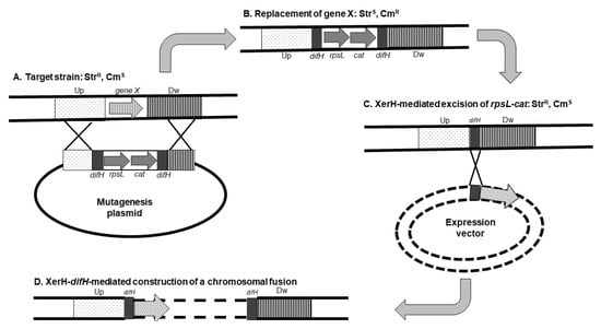 Construction of unmarked deletion and chromosomal fusion in Helicobacter pylori. A mutagenesis plasmid is introduced in the strain from which a gene (gene X) is to be deleted. This strain harbors a mutation of the rpsL gene that confers resistance to streptomycin (StrR). The mutagenesis plasmid contains the following elements: (i) two copies of difH, a target of the site-specific recombinase XerH flanking (ii) an rpsL allele that restores sensitivity to streptomycin (StrS), and (iii) a cat gene that confers resistance to chloramphenicol (CmR); the difH-rpsL-cat-difH cassette is flanked by (iv) regions corresponding to sequences upstream (Up) and downstream (Dw) of the gene to be deleted. After the introduction of the mutagenesis plasmid (A), the target gene is replaced by the difH-rpsL-cat-difH cassette via homologous recombination between the upstream and downstream sequences from the plasmid and the chromosome; the resulting strain has an StrS-CmR phenotype (B). Growth of this strain in the absence of chloramphenicol and the presence of streptomycin enables the selection of excision of the rpsL-cat cassette via the activity of H. pylori XerH recombinase (C) leaving a single difH copy at the chromosomal location of the deleted gene (StrR-CmS phenotype). This difH copy can be used to insert a genetic construct in the chromosome of the resulting strain (D). Partially adapted from [30].