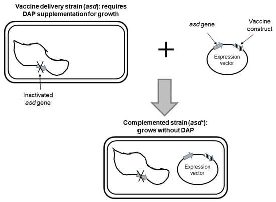 Balanced-lethal expression system for Helicobacter pylori. The recombinant vaccine carrier strain lacks asd gene and requires supplementation of diaminopimelic acid (DAP) for growth in vitro. Introduction of a plasmid vector harboring asd gene and expressing a vaccine construct complements for inactivated chromosomal asd gene. Adapted from [40].