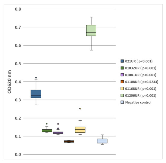The E. coli strain 01108UR did not produce any biofilm because the optical density was similar to that of the negative control. Five strains showed different biofilm-formation capabilities (see Figure 1). The two strains (021UR and 01206UR) with the highest optical density values were selected for further MIC and MBEC testing.