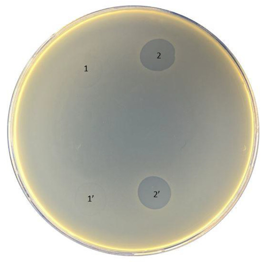 The susceptibility of bacteriophages was detected using the spot test. For the test, the bacteria were grown overnight in LB broth. Approximately 5 mL of melted semi-liquid 0.7% LB semi-liquid melted agar was added to 100 μL of bacterial suspension in a sterile tube. The suspension was gently mixed and poured onto a thin layer of the TSA plate. The plates were left stationary until the upper layer of LB agar was completely solidified. With a pipette, 10 μL of the phage lysate 106 PFU/mL was dropped onto the plates and left in aseptic conditions at room temperature until the drops dried. Subsequently, the plates were incubated overnight at 37 °C. The test results were determined the following day by visually evaluating the effect on the plates and considering it as confluent (+++), semi-confluent (++), overgrown or partial lysis and individual plaques (+), or no lysis (−).