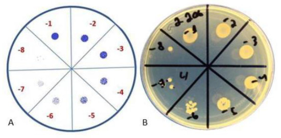 Colony-forming unit spot test. (A) Schematic representation; (B) visual representation.