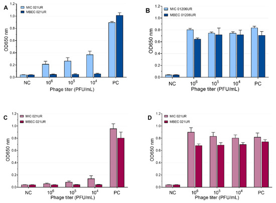 Ses and Intesti phage effects at different concentrations represented as mean values. (A) MIC and MBEC in 021UR by SES; (B) MIC and MBEC in 01206UR by Ses; (C) MIC and MBEC in 021UR by Intesti; (D) MIC and MBEC in 01206UR by Intesti.