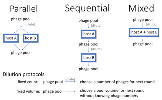 Three alternative host-presentation protocols (Parallel, Sequential, Mixed) differ in how phages are distributed to two different hosts on which growth is desired. Each box around a host type (A or B or both) represents a separate culture of hosts to which phage are added and grown. The figure illustrates a single cycle, but typically a procedure is carried out for several cycles. The figure also includes two dilution protocols that may be used when distributing phages into the next cycle (fixed count, fixed volume).