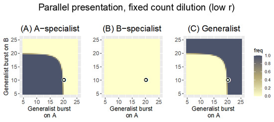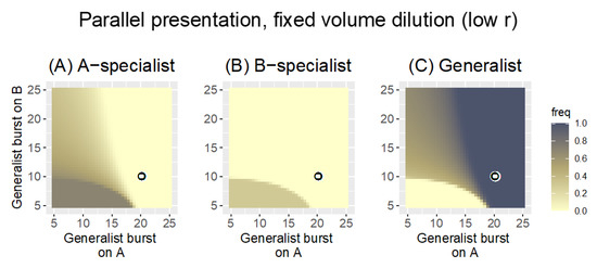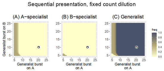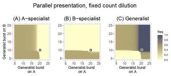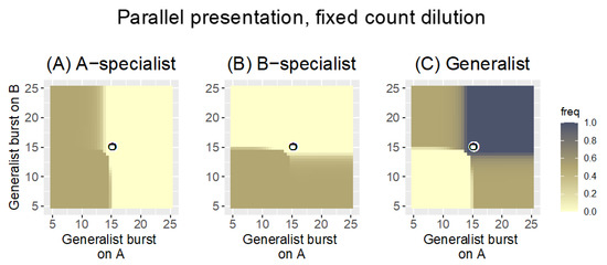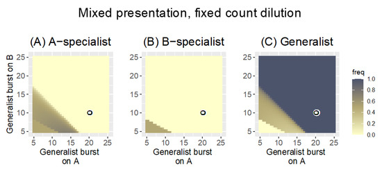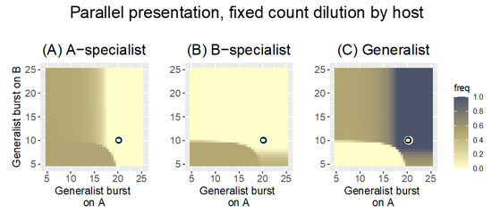 The results are clear (Figure 2) and in agreement with the impressions from the heuristic results in Equation (2a,b). The fate of the generalist is governed by its burst sizes relative to the coordinates of the pair of specialist burst sizes (bA|A =15, bB|B = 15, given by the coordinates of the black-on-white ring): the generalist is lost if neither of its burst sizes is as good as that of the respective specialist. Likewise a specialist is lost if the generalist has a superior burst on that host. There are intermediate zones, and the generalist is not completely lost until its burst sizes fall somewhat below those of the specialists. Each specialist is lost as the respective generalist burst size exceeds 15, but there is a slight ‘shoulder’ effect in which the specialist is more prone to loss as the generalist performs well on the other host. This latter effect is consistent with the ratios in Equation (2a,b), that the generalist is somewhat better at suppressing one specialist as it does relatively better against the other specialist. Overall, Parallel presentation is a ‘fair arbiter’ of phage performance on each host: the best-growing phages are retained on each host.