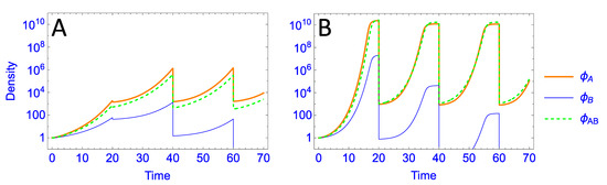 Temporal, short-term dynamics of phage in Parallel-presentation trials of Figure 4 (panel A above) and Figure 3 (panel B above); the generalist has burst sizes of 17 on both hosts, representing a point in the heat map of Figure 4 at which only the A-specialist is maintained but at which the A-specialist and generalist are maintained in Figure 3. Comparison of these dynamics reveals why the two growth conditions yield such differences in patterns of phage maintenance between the different conditions of Figure 3 and Figure 4. With a low bacterial growth rate (r = 0.1, A) the phages never exhaust the bacteria before dilution; in essence, the phages are maintained in a constant state of exponential growth, and the fastest grower sets the threshold for dilution such that other phages are progressively diluted to extinction. Increasing the bacterial growth rate to r = 0.3 (B) has the unintuitive effect of allowing accelerated phage growth toward the end of a cycle; as cell densities reach high levels, phage growth accelerates, exhausting the cells. Even slowly growing phages can recover from low transfer densities and attain high densities by cycle’s end. This exhaustion of hosts allows slowly growing phages on one host to be maintained along with fast-growing phages on the other host. Note that there are no units of density or time because they are relative to each other, to the other variables, and to the parameters. See Methods for an explanation.