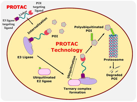 Proteolysis-targeting chimeras (PROTACs) are bifunctional protein degraders that use the E3 ubiquitin ligase pathway for the degradation of the protein of interest. A PROTAC molecule consists of three components: a ligand moiety that targets the protein of interest (POI), another ligand that binds to E3 ligase, and a linker, which bridges between these two ligands [1]. The main function of these ligands is to attract E3 ligase and POI and initiate polyubiquitination for degrading POI via the ubiquitin–proteasome system (UPS) (Figure 1) [2]. The ubiquitin–proteasome system is an essential pathway of every eukaryotic cell for maintaining homeostasis and regulating gene transcription and translation, cell cycle, and apoptosis [3]. In the ubiquitin proteolysis pathway, the ubiquitin molecule binds to the ubiquitin-activating enzyme E1. The E1-bound ubiquitin transfers the ubiquitin to the E2-conjugating enzyme, which is later transferred to E3 ligase, and, finally, ubiquitin binds to POI. These are ATP-driven cascades of reaction where the ubiquitin molecule is transferred from one molecule to another and, finally, to POI. Similarly, several ubiquitin molecules bind to the POI, which signals the proteasome to initiate the degradation of the polyubiquitinated POI. This innate protein degradation pathway is utilized for degrading POI.
