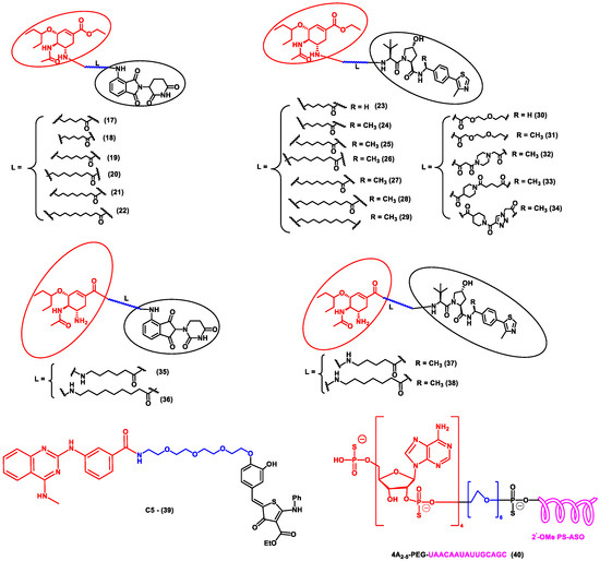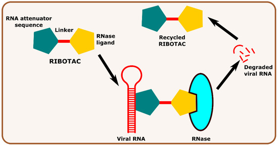 Other interesting subcategories of PROTAC are ribonuclease-targeting chimera (RIBOTAC) and nucleic acid-hydrolysis-targeting chimera (NATAC). Both strategies were used to develop novel degraders. In RIBOTAC, RNase is the degrader system, and it degrades viral RNA, while NATAC uses oligonucleotide sequences to identify the POI, and further, they could be degraded by RNase L (specific for ss-RNA). Haniff et al. developed a RIBOTAC degrader that targets the RNA genome of the SARS-CoV-2 virus (Figure 3). RIBOTAC has two major constituents- a small molecule known as C5 (39) and an RNA attenuator hairpin (AH). This RNA attenuator hairpin binds to the RNA genome, and C5 (39) recruits endonucleases present in the cell and initiates the degradation of the viral genome (Figure 4) [53]. This strategy might provide solutions for various viral infections, and the only challenge is identifying and optimizing the appropriate attenuator sequence, which could bind toward a target of interest.