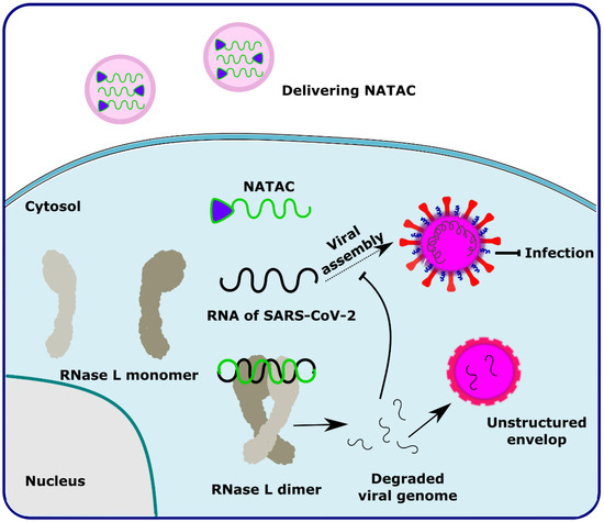NATAC is another promising approach to PROTAC technology (Figure 5). NATAC explores the function of RNase L; RNase L is an innate RNA degrading enzyme that targets UN^N sites of the viral or single-stranded RNA. Tang and his group designed a NATAC molecule having a 5’ phosphorylated 2’-5’ polyA sequence that attracts RNase L, and another end had an antisense oligonucleotide strand targeting the spike protein of SARS-CoV-2 (Compound 40) (Figure 4). The knockdown efficiency of spike proteins by NATAC molecules was evaluated, and it was found that NATACs could significantly reduce the RNA sequence of the spike protein. Interestingly, it was also found that RNase L could also increase the mRNA level of IFN-β and IL-6 in the host cells, thereby increasing the production of interferon and further enhancing the anti-viral response in the host cell [54].