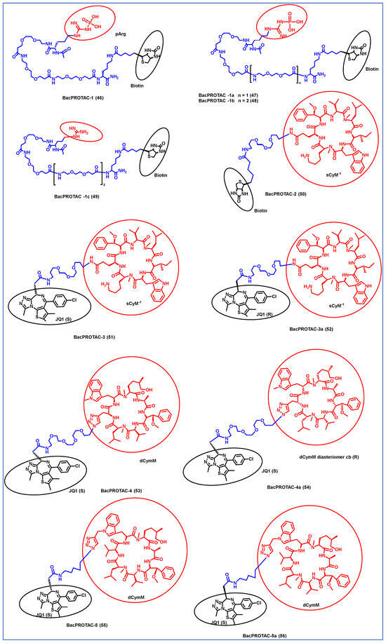 Morreale et al. synthesized four different BacPROTACs (46–49) using the arginine peptide linker and the targeted POI was biotin (Figure 7) [61]. ClpC protease-mediated degradation is enabled by the BacPROTAC-1 (46) consisting of monomeric streptavidin that targets biotin and a ClpCNTD anchor which has phosphorylated arginine residues mimicking bacterial degradation tag. The characterization of the designed BacPROTAC was performed using isothermal titration calorimetry (ITC), and the results revealed that it has a high affinity towards the biotin moiety (KD = 0.69 µM). The BacPROTAC-1 was further modified to obtain three more compounds, one of which (BacPROTAC-1c, 49 had nonphosphorylated arginine residue as linker, while BacPROTAC -1a and BacPROTAC-1b (47 and 48) had modification with the chain length spacing between the biotin and the phosphorylated arginine residue. However, these variations did not affect the degradation efficiency of these four molecules.