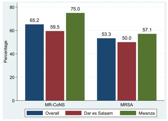 Finally, we would like to acknowledge as a limitation the fact that, for some isolates, there may be a lack of differences in antibiotic resistance between the two regions due to the small sample, such as, for example, in the resistance to ciprofloxacin, clindamycin, and nitrofurantoin for S. aureus isolated in Dar es Salaam, which occurred in only 16 cases (7, 5, and 7 cases, respectively), and for n = 14 in Mwanza (11, 10, and 1 cases, respectively). The comparison of these specific isolates does not include many people.