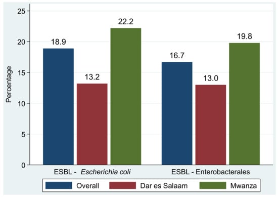 The proportions of methicillin-resistant S. aureus (MRSA) and methicillin-resistant CoNS among S. aureus and CoNS causing community acquired urinary tract infections were 53.3% (16/30) and 65.2% (43/66), respectively (Figure 1). The overall prevalence of extended-spectrum β-lactamase (ESBL) production among Enterobacterales was 16.7% (37/221), of which 13% (13/100) was reported in isolates from Dar es Salaam and 19.8% (24/121) was reported from Mwanza. In particular, about 18.9% (27/143) of E. coli were ESBL producers, of which Mwanza reported a prevalence of 22.2% (20/90) while Dar es Salaam reported a prevalence of 13.2% (7/53) (p = 0.304) (Figure 2).