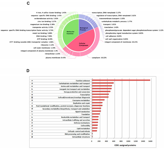 Additionally, in the RAST server, functional annotation of the genome revealed the presence of 595 subsystems (39% unassigned). The gene ontology data showed the distribution of genes for different components and functions. The biological processes includedgenes involved in transcription 5.37%, regulation of transcription 2.62%, transmembrane transport 1.93%, carbohydrate metabolic process 1.77%, cell adhesion 0.85%, cell wall organization 0.83%, and integral component of membrane 20.25%. The cellular components included cytoplasm with 10.22%, and the molecular function included genes with oxidoreductase activity 1.93%, zinc ion binding 2.27%, magnesium ion binding 2.36%, plasma membrane 6.43%, DNA binding 7.99%, ATP binding 8.49%, and transporter activity 2.53% (Figure 1C,D).