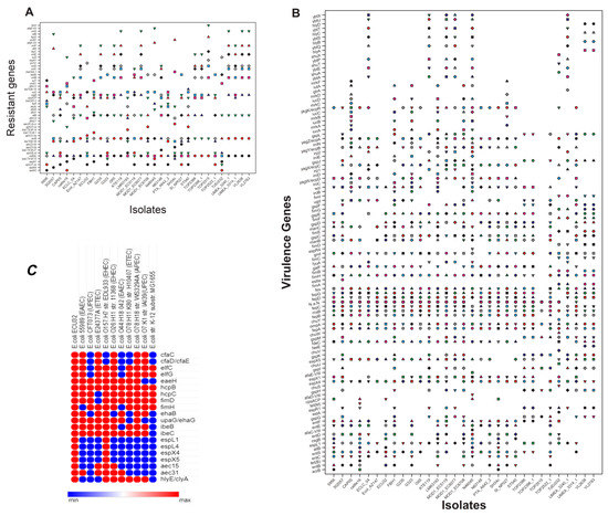 Virulence genes were analyzed and compared with different ST540 strains and pathotypes. The analysis demonstrated the prevalence of virulence genes that are involved in adherence, autotransporter, invasion, non-LEE-encoded TTSS effectors, secretion system, toxin, and others (Figure 2B,C).