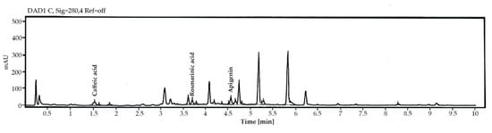 CEE was analyzed using HPLC. The HPLC 1290 Infinity II system: Zorbrax Eclipse Plus C18 column (2.1 × 50 mm, 1.8-Micron; Becton, Dickinson and Company, Franklin Lakes, NJ, USA) with an ultraviolet (UV) detector (280 nm) was used at a gradient flow of 0.5 mL/min. The mobile phase composition was 3% acetic acid in water: 1% acetic acid in water acetonitrile. The injection volume was 2 μL. The column temperature was maintained at 30 °C. The stock extract solution (10 mg/mL) was dissolved in methanol and filtered through 0.45-µm nylon membrane filters before performing HPLC. The compounds present in the extracts were characterized according to their UV–vis spectra and identified in terms of their retention time relative to that of known standards: rosmarinic acid, apigenin, and caffeic acid (Sigma Aldrich, St. Louis, MO, USA) []. A standard graph was generated using standard solutions of 5–500 µg/mL. The regression equation correlating to the area under the peak (Y) and standard (X) was as follows: Y = 5.04 (X: rosmarinic acid) + 4.37, Y = 8.98(X: apigenin) + 0.31 and Y = 13.04 (X: caffeic acid) + 1.31.