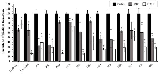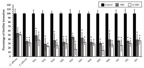 Effects of Coleus amboinicus essential oil on the biofilm formation of Candida albicans ATCC 90028, Trichophyton rubrum, and Microsporum canis after 96 h of treatment. Each bar represents the mean ± SD of three experiments per group. * differences between the control and treatments were statistically significant (p < 0.05).