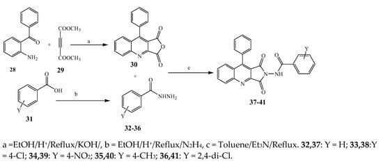 - Hosseyni Largani, T.; Imanzadeh, G.; Zahri, S.; Noroozi Pesyan, N.; Şahin, E. A facile synthesis and antibacterial activity of novel pyrrolo [3, 4-b] quinolin-2 (3H)-yl) benzamides. Green Chem. Lett. Rev. 2017, 10, 387–392. [Google Scholar] [CrossRef]