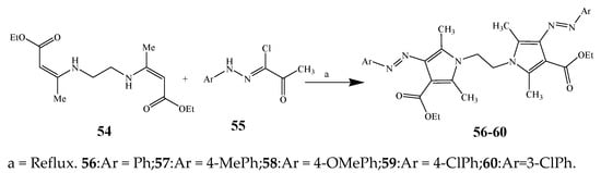 - Kheder, N.A. Hydrazonoyl chlorides as precursors for synthesis of novel bis-pyrrole derivatives. Molecules 2016, 21, 326. [Google Scholar] [CrossRef] [PubMed]