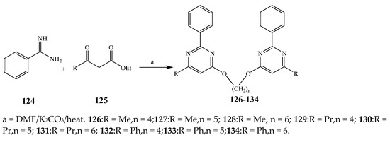 - Mahmoodi, N.O.; Shoja, S.; Sharifzadeh, B.; Rassa, M. Regioselective synthesis and antibacterial evaluation of novel bis-pyrimidine derivatives via a three-component reaction. Med. Chem. Res. 2014, 23, 1207–1213. [Google Scholar] [CrossRef]