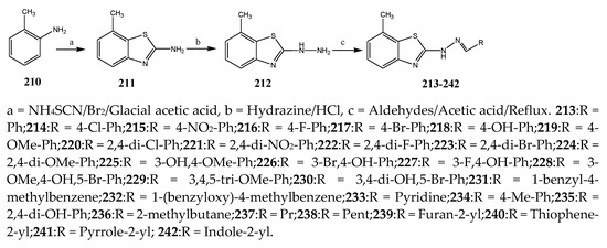 - Zha, G.-F.; Leng, J.; Darshini, N.; Shubhavathi, T.; Vivek, H.; Asiri, A.M.; Marwani, H.M.; Rakesh, K.; Mallesha, N.; Qin, H.-L. Synthesis, SAR and molecular docking studies of benzo [d] thiazole-hydrazones as potential antibacterial and antifungal agents. Bioorganic Med. Chem. Lett. 2017, 27, 3148–3155. [Google Scholar] [CrossRef]