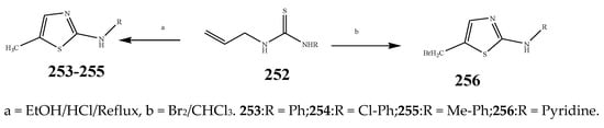 - Khare, R.; Sharma, J.; Sharma, A. Synthesis, characterization, and antibacterial activity of some thiazoles derived from allyl thioureas. Russ. J. Gen. Chem. 2016, 86, 702–707. [Google Scholar] [CrossRef]
