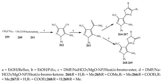 - Beyzaei, H.; Aryan, R.; Molashahi, H.; Zahedi, M.M.; Samzadeh-Kermani, A.; Ghasemi, B.; Moghaddam-Manesh, M. MgO nanoparticle-catalyzed, solvent-free Hantzsch synthesis and antibacterial evaluation of new substituted thiazoles. J. Iran. Chem. Soc. 2017, 14, 1023–1031. [Google Scholar] [CrossRef]