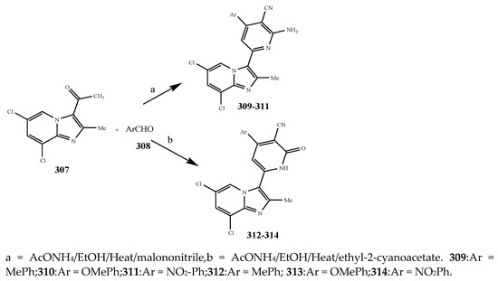 Sirisha, K. et al., 2010 reported the synthesis of twenty 1,4-Dihydropyridines (287-306) from a condensation reaction of aromatic aldehyde, ammonium acetate and N-heteroaryl acetoacetamide as shown in Scheme 22. The in vitro antibacterial activity of the synthesized compounds was executed against the strains using streptomycin and tetracyclin as reference drugs. Data analysis showed that compound 299 with 2-pyridyl at position C-4 and N-(6-methylpyridin-2-yl) at the C-5 and C-3 position was equipotent to tetracyclin/streptomycin across negative strains, while compound 305 was more effective against B. subtilis. Compounds 292, 295 and 299 also had good inhibitory activity across MRSA [37]. Althagafi and Latif, 2021 reported the synthesis of the derivatives of 6,8-dichloro-imidazo[1,2-a]pyridine (309–314), including pyrazole, thiazole, and pyridine ring, as represented in Scheme 23. They evaluated synthesized compounds against K. pneumonia, E. coli, B. subtilis, and S. aureus. The antibacterial screening presented that many tested compounds displayed significant activity against both strains of bacteria. The compounds 316, 317, 318 and 319 had the maximum inhibitory activity across most of the bacterial species, while 318 exhibited tremendous activity against all strains as compared to gentamycin and ampicillin (Table 1). Furthermore, compounds 317 and 316 revealed significant activity toward E. coli. Compound 318 also showed the same value of MIC against K. pneumonia [38]. The synthesis of Pyrido[2,3-d]pyrimidine was undertaken by a reaction of the derivatives of cyanoacetylurea with arylidines or aromatic aldehydes as shown in Scheme 24 and Scheme 25. Antibacterial activity was performed for all the targeted compounds against E. coli and S. aureus strains using gentamicin as a standard drug. From the data of the antibacterial activity, it was observed that the compounds 316, 320, 319, 322 and 321 had displayed tremendous activity across all the strains with a 16.5 to 24mm zone of inhibition (ZOI) value compared to the reference drug (ZOI 15 mm) [39]. Pyrimidine (326–332) and pyridine (333–341) were synthesized according to Scheme 26 and screened against different bacteria [40]. The compounds 326–332 and 333–341 exhibited promising activity against K. planticola. Correspondingly, compounds 326–332 and 335–336 also showed appreciable activity against S. aureus. From the SAR study, it was estimated that the activity of the compounds was due to the existence of pyrimidine fused to the skeleton of pyrazolo[3,4-b] pyridine with a particular substitution pattern [40]. Pyridine derivatives were synthesized by Jemmezi et al., 2014 from a cyclocondensation reaction as shown in Scheme 27. All the synthesized compounds were screened for their antibacterial activity against Vibrio vulnificus, Vibrio cholera, Vibrio alginoliticus and Vibrio parahaemolyticus. It was revealed that the synthesized compounds had significant biological activities. Compound 344 was found to be the one that showed the best activity, which is comparable to the activity of tetracycline. This was due to the presence of an aldehyde function, which imparted its tremendous biological activities [41].