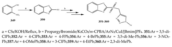 The synthesis of oxazole was carried out according to the reaction scheme shown in Scheme 28 by Ferouani et al., 2018. The synthesized compounds were evaluated for their in vitro antibacterial activity against Enterococcus faecium (DSM 20477), E. coli (CECT 515) and Clostridium perfringens (CECT 486) using ampicillin and gentamicin as standard drugs. Among the synthesized compounds, the ones with 4-F, 2-OH and 4-CH3 exhibited remarkable activity across all three bacterial strains [7]. The compounds also displayed better activity in comparison with the reference drugs, while remaining compounds indicated good activity, except for the one containing 4-N(CH3)2, which exhibited complete retardation against all the bacterial strains. The compound 348 displayed the equivalent antibacterial activity against E. faecium and E. coli, while compounds with 4-OMe and 2-F were found to be active across only one bacterial strain each (C. perfringens and E. faecium, respectively) (Table 1). Babu et al., 2019 reported the synthesis of 2-sulfonyl benzoxazole compounds (351-360) comprising the nucleus of 1,2,3-triazole through a highly effective and naturally favorable ionic liquids microwave-assisted method as shown in Scheme 29. Among all the synthesized compounds, 353 with a moiety of 4-fluoro phenyl triazole at 2-sulfonyl benzoxazole showed persuasive activity against P. aeruginosa (MIC = 6.25 μg/mL), E. coli (MIC = 3.12 μg/mL) and S. epidermidis (MIC = 6.25 μg/mL), and mild activity against B. subtilis (MIC = 12.5 μg/mL). The other compounds displayed moderate to low activity. All results were analogous to streptomycin [42]. The derivative compounds 1,2-Oxazole (364–369) were synthesized by Arshad, M. 2018 as shown in Scheme 30. They were estimated computationally to determine their physicochemical properties and also screened for their antibacterial activity against S. aureus, S. epidermidis, E. coli, and P. mirabilis. The antibacterial study indicated that four synthesized compounds 365, 367, 368 and 369 exhibited activities greater than the reference drug (ciprofloxacin). It was also revealed that all six products displayed larger activity and lesser MIC than the reference drug [43].