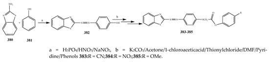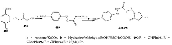- Abdel-Galil, E.; Moawad, E.B.; El-Mekabaty, A.; Said, G.E. Synthesis, characterization and antibacterial activity of some new thiazole and thiazolidinone derivatives containing phenyl benzoate moiety. Synth. Commun. 2018, 48, 2083–2092. [Google Scholar] [CrossRef]