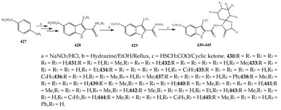 - Güzel-Akdemir, Ö.; Trawally, M.; Özbek-Babuç, M.; Özbek-Çelik, B.; Ermut, G.; Özdemir, H. Synthesis and antibacterial activity of new hybrid derivatives of 5-sulfamoyl-1H-indole and 4-thiazolidinone groups. Mon. Chem.-Chem. Mon. 2020, 151, 1443–1452. [Google Scholar] [CrossRef]