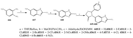 - Cheddie, A.; Shintre, S.A.; Bantho, A.; Mocktar, C.; Koorbanally, N.A. Synthesis and antibacterial activity of a series of 2-trifluoromethylbenzimidazole-thiazolidinone derivatives. J. Heterocycl. Chem. 2020, 57, 299–307. [Google Scholar] [CrossRef]