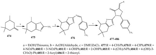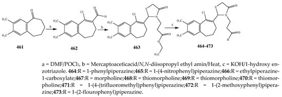 - Jilla, L.; Kolluri, P.K.; Bujji, S.; JP Naikal, S. Synthesis and antimicrobial agents of thiazolidinone derivatives from benzocyclohepetenone. J. Heterocycl. Chem. 2020, 57, 4078–4087. [Google Scholar] [CrossRef]
