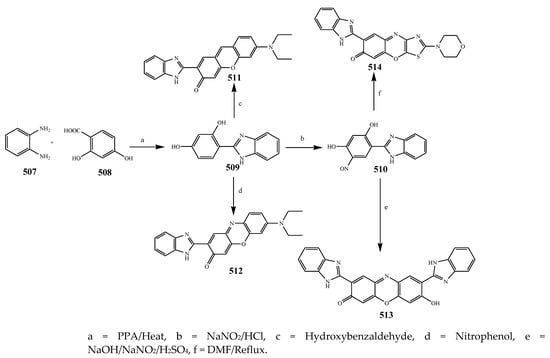 - Patil, V.S.; Padalkar, V.S.; Phatangare, K.R.; Umape, P.G.; Borase, B.N.; Sekar, N. Synthesis, Characterization, and Antibacterial Activity of Novel (1H-Benzo [d] imidazole-2-yl)-6-(diethylamino)-3H-one-xanthene, Phenoxazine, and Oxazine. J. Heterocycl. Chem. 2015, 52, 124–129. [Google Scholar] [CrossRef]
