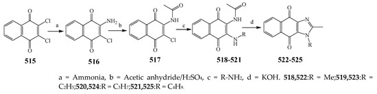 - Choudhari, D.; Salunke-Gawali, S.; Chakravarty, D.; Shaikh, S.R.; Lande, D.N.; Gejji, S.P.; Rao, P.K.; Satpute, S.; Puranik, V.G.; Gonnade, R. Synthesis and biological activity of imidazole based 1, 4-naphthoquinones. New J. Chem. 2020, 44, 6889–6901. [Google Scholar] [CrossRef]