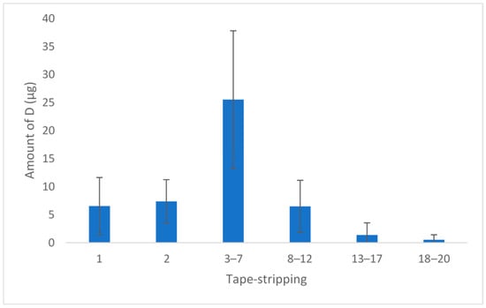 Before HPLC analysis, we checked the selectivity of the method and the adhesive of the tape used did not produce interferences during the test. The mean amount of D obtained on each strip of the five replicates is shown in Figure 2. A concentration of 48 µg in the SC was obtained (corresponding to 38% of the dose applied in the permeation experiment: 110 µg).