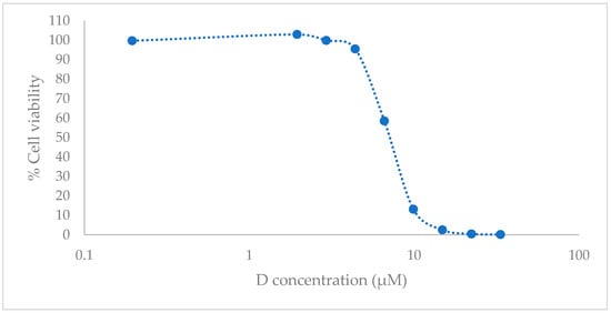 After 72 h of treatment, in a testing range from 0.20 to 33.36 µM, which corresponds from 0.06 to 9.89 µg/mL, the D resulted in a cytotoxic compound with an IC50 value of 6.97 µM (2.31 µg/mL) (95% confidence interval (CI), 6.76 to 7.18) (Figure 3).