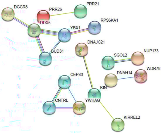 Forty-nine genes presented with a differential expression after treatment with D versus cells without treatment. The differentially expressed genes were further classified into two groups: upregulated genes (Table 3) and downregulated genes (Table 4). The main association between the altered genes is represented in Figure 4.