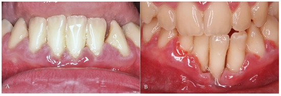 During the follow-up period (9 years), periodontal maintenance sessions were performed 3 times a year, which consisted of tartar removal with ultrasound and scaling and root planning in the more compromised areas (on 5 occasions, the procedure was performed on all teeth). During these years, the patient had recurrent episodes of exacerbation (Figure 1A) with pain, spontaneous gingival bleeding, ulcers in the interdental papilla, and increased tooth mobility, which were resolved clinically with the administration of systemic antibiotics without the need for mechanical periodontal procedures (Figure 1B). Despite the periodic periodontal treatment, the periodontal pockets progressively deepened and bone loss increased with time (Figure 2A,B), causing the premature loss of some teeth. However, the favorable clinical response of the recurrent episodes of periodontitis exacerbation to the systemic antibiotic therapy was the main argument for establishing the analysis of its impact on the composition of the oral microbiota.