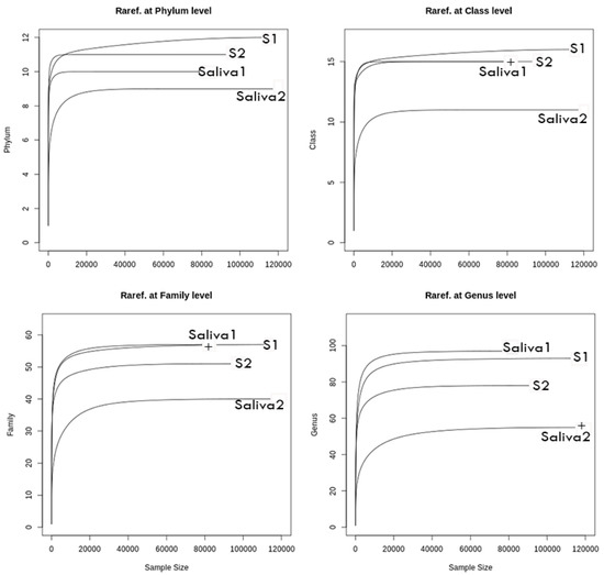 General rarefaction graphs. Rarefaction analysis permits estimating the overall diversity covered by the obtained squences. The figures represent the number of sequences (x axis) versus the number of taxa (y axis). S1, baseline subgingival sample; S2, post-therapy subgingival sample; Saliva 1, baseline saliva sample; Saliva 2, post-therapy saliva sample.